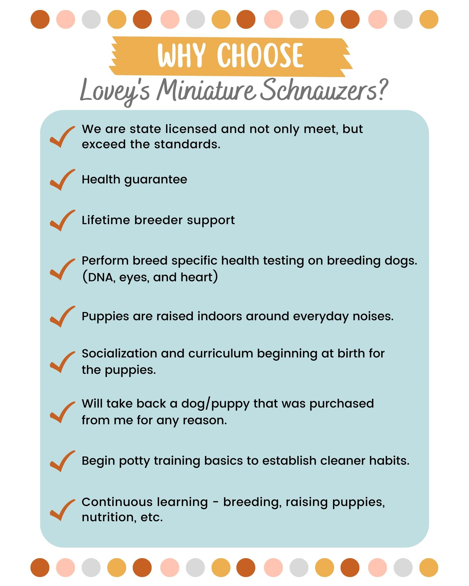 For final payment, personal checks must be sent 2 weeks prior to picking up your puppy.