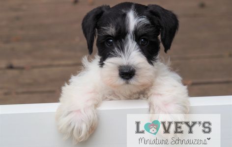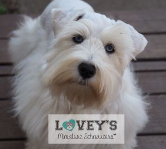 Mini Schnauzers can produce certain eye colors. If either parent has blue eye(s) then their offspring can have blue eyes as well. This can vary as to how much blue is present in the offspring. It can be two blue eyes, 1 blue eye, a partial blue eye, or flecks of blue in one or both eyes.